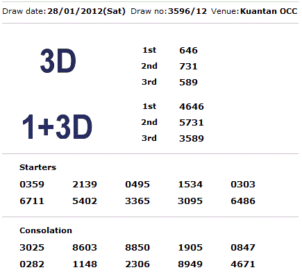 4D Result Malaysia 4D Results as Of 28th Jan 2012